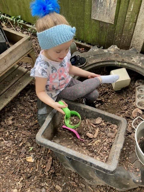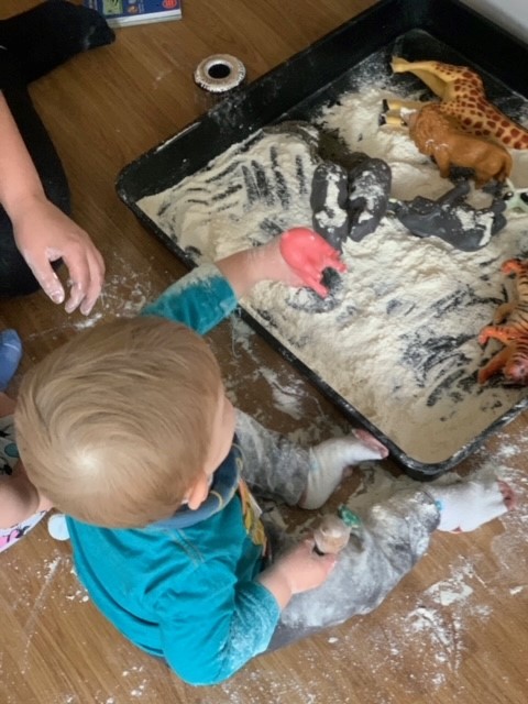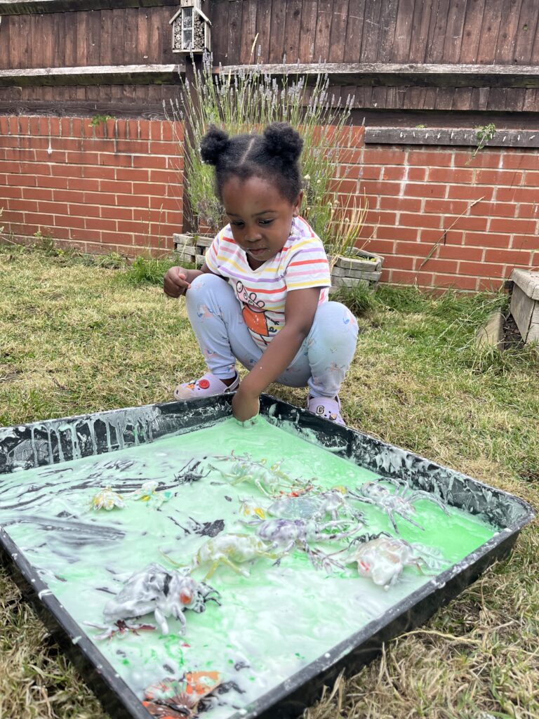 The children have had a fantastic month exploring a variety of educational learning opportunities based on their individual interests. The children have been enjoying the varied weather and exploring the outdoor environments through a range of activities which has led to some amazing outdoor learning opportunities. There have been lots of spider and bug hunts around the garden, which has then led to spider sensory trays and looking at the shapes in the environment around them.