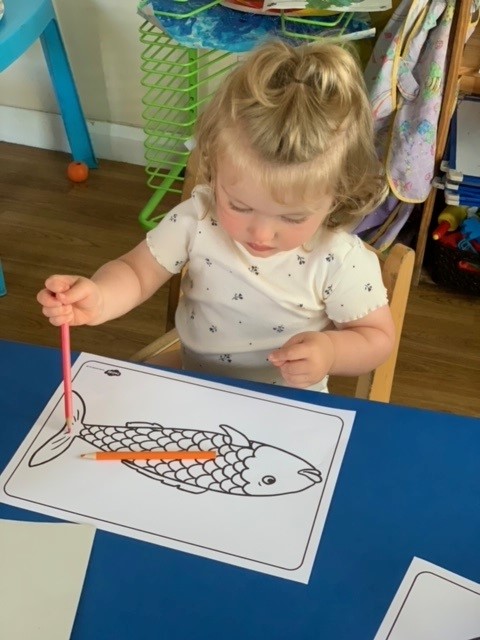 Sea creatures have taken place with the children using their feet to splash around, they have also been practising their filling and pouring skills in the water. Paper plate suns have also been created using yellow resources. The sand in the garden has been a favourite and the children have been making their own sandcastles. Some lovely artwork has been produced including using cereals to create starfish and crabs. Lots of new words have been learnt and the children have been excited to share these with their peers when talking about what they can see and their own experiences of visiting the beach with family and friends.